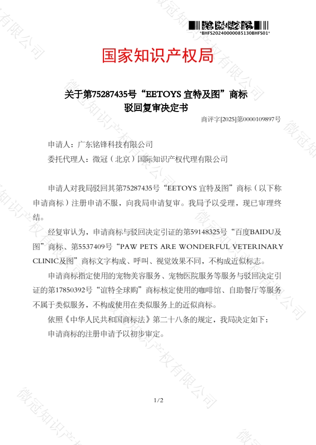 申請人對其注冊的第75287435號“EETOYS宜特及圖”商標被商標局駁回不服,特委托我公司代理該商標的復審事宜,并最終取得維權成功。
